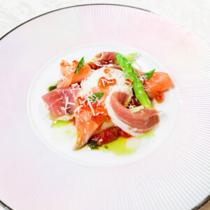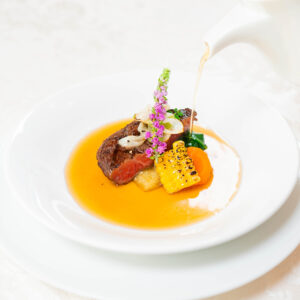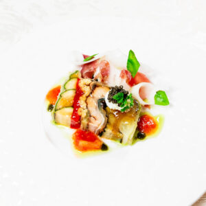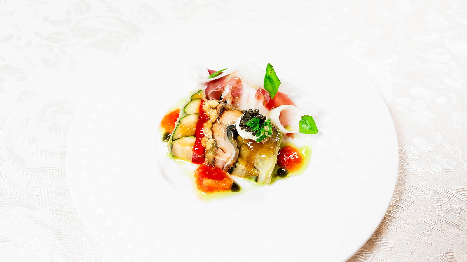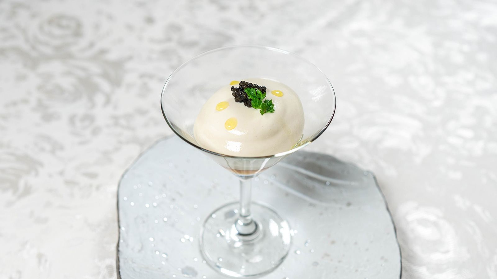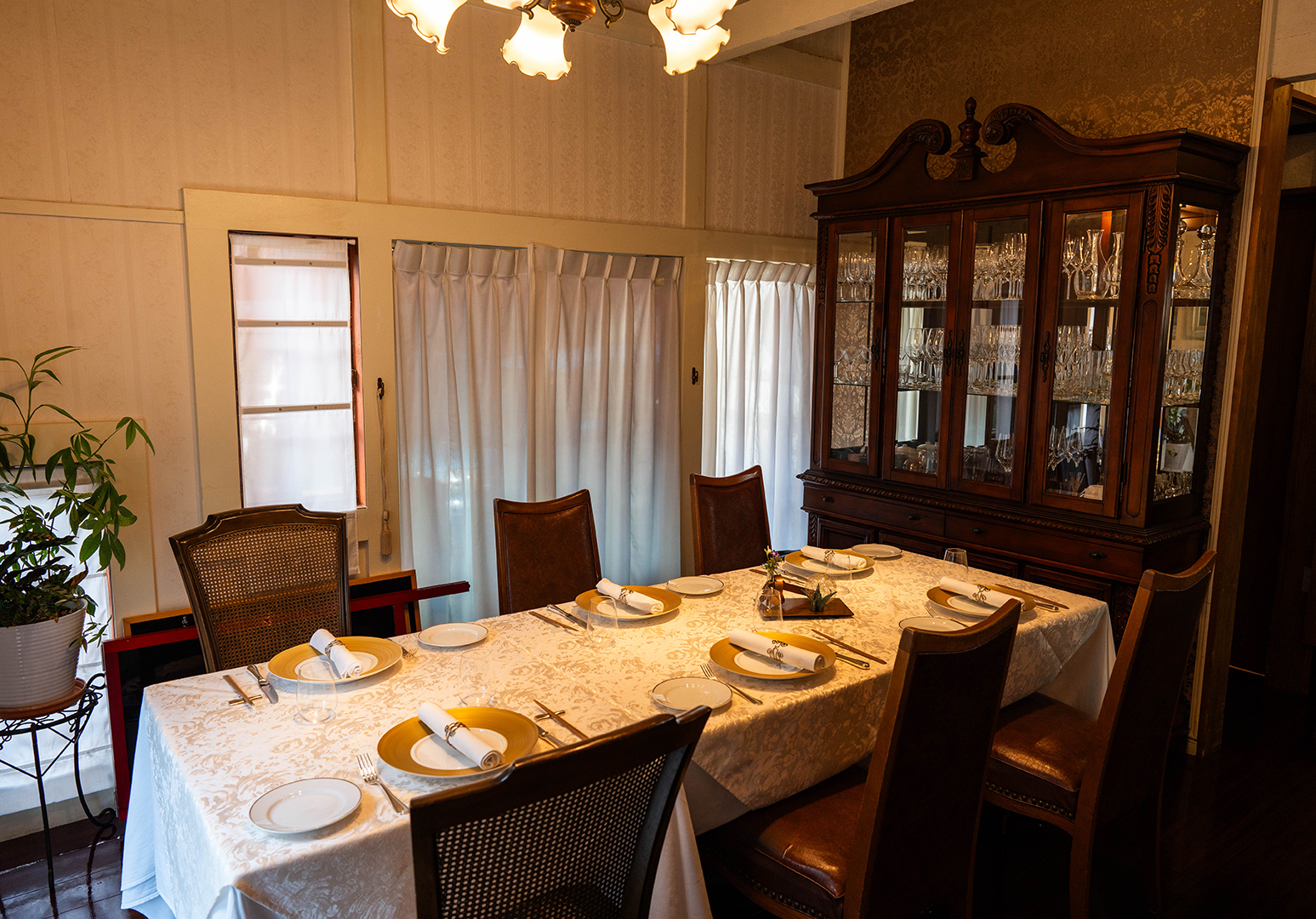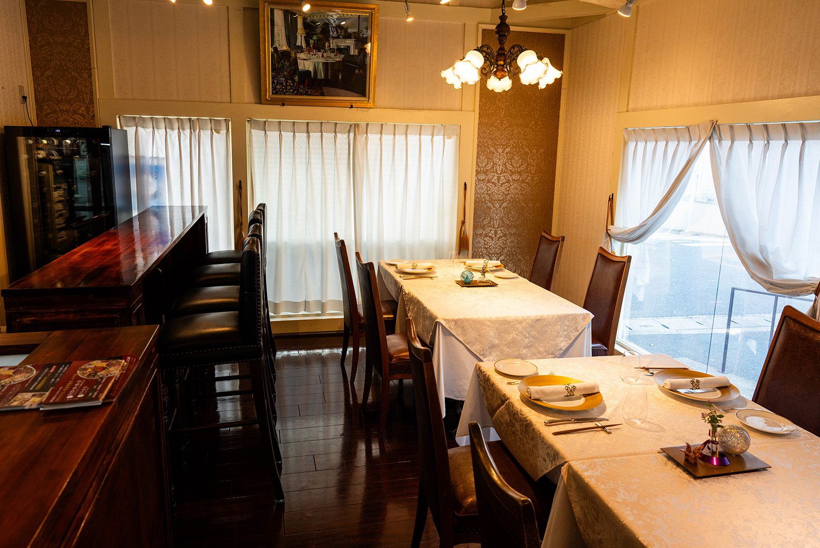 全18席の店内は、クラシカルな調度類が並ぶ落ち着いた雰囲気。白のクロスを纏ったテーブル席、ゆったりと腰を落ち着けることができる椅子が、寛ぎの雰囲気を演出しております。大きくとられた窓からは、温かな日の光が差し込み、ランチライムには和やかな空気が流れます。また、夜になると店内は、穏やかな灯に照らされ、よりムーディに。隠れ家的な雰囲気の空間で、どなたも寛ぎのひと時をお過ごしください。